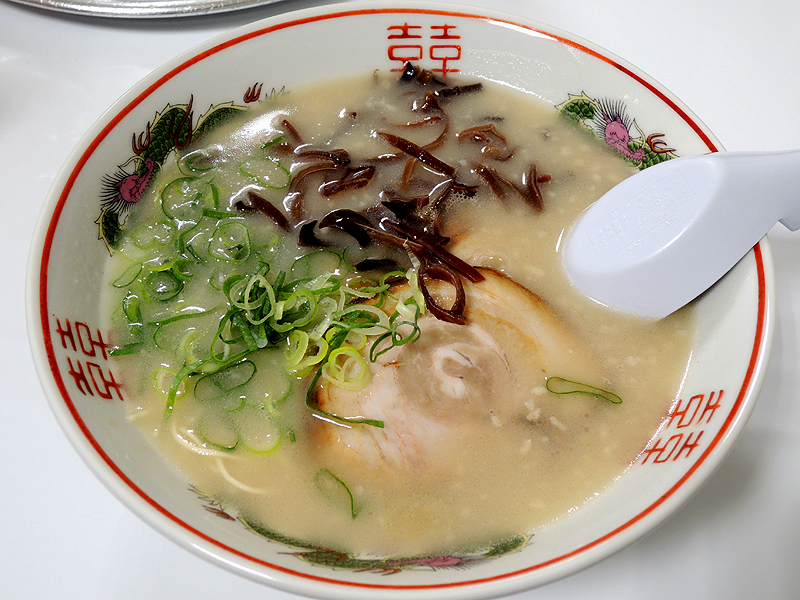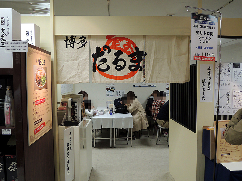 百貨店の九州物産展で博多だるまが出店するのは珍しくなく、特に意識していなかったのですが、同時期に開催されている星ヶ丘三越の九州展でも出店、それをボスが食べていたのを見て釣られたのと、中日ドラゴンズ展が開催されていたこともあり、名鉄百貨店へ。 夕方の時点で限定の2品は売り切れ。デフォのラーメンをいただきます。 博多だるまは未食ですが、グループの括りとしては、かつて麺横にあった博多秀ら〜と同じ。上海には日本九秀拉麺なんてのもありました。短命でしたけど。 ラーメンにはそんなに期待していなかったのですが、これがなかなか、ちゃんとしています。とろみがあって、野獣臭さは無いもののしっかり豚骨。ややタレの塩気が気になるものの、脂っこさはなく、飲んでいて飽きないスープ。 極細ストレート麺は固さの指定はしないものの、サックリと固めの仕上がり。チャーシューはボスの画像と比較するとちょっと貧弱かも。 途中から卓上の紅生姜をプラス。スープは少し残しましたが、物産展価格以外は満足。 (14年4月5日訪店) |