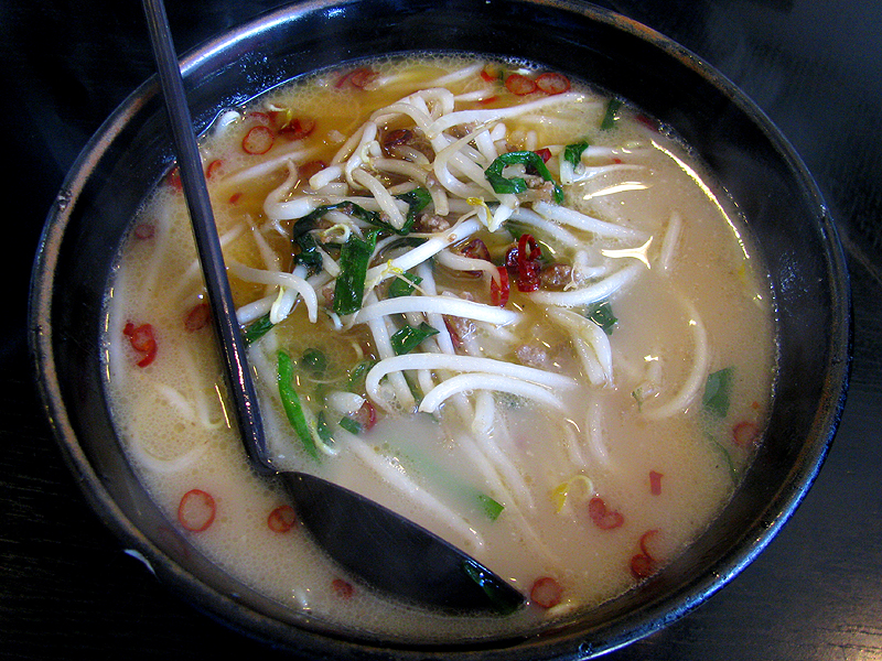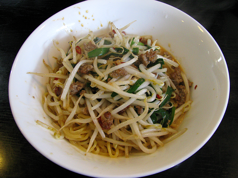 自宅から徒歩圏内のご近所さんですが、前々回の訪問は10年以上前。ココは元々、らーめん江楽@大森のご主人が 立ち上げた店で、この店の主人として中京テレビ「P.S 愛してる」にもスタジオ出演した記憶があります。 お弟子さん譲られて?からはバリエーションがグンと増えて・・・それが足が遠のいた一因でもあるわけですが、 とにかく久しぶりです。 どこかの掲示板でオススメ投稿のあった、つゆなし台湾らーめんを注文。 提供されて、思わず口にした言葉は「丼小さっ!」。麺量はデフォと同じなのでしょうか。ボリュームが無いというか、かなり貧弱に 見えます。 麺の下には豚骨っぽいスープというかタレが見えています。ココは豚骨って言ってもアレですから、味付けもそのようなもの。 台湾だからといって、特に辛味が際立つものでもないですね。中細縮れの麺は特に思うところなく。 具のモヤシのシャキシャキ感はいいのですが、ミンチの量が極端に少なくて残念。 期待しすぎだったのか、ちょっと残念な一杯でしたね。これでまたしばらく足が遠のきます。 (09年7月10日訪店)