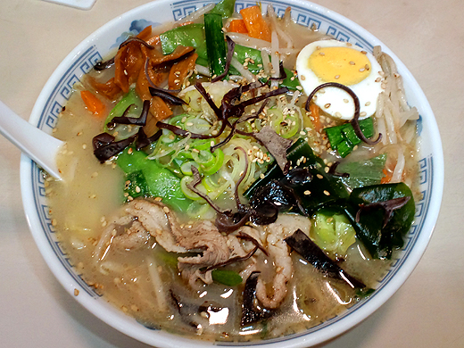 ![]() 主人が「日本一美味い」「不味かったらお金は要らない」とか言って呼び込みしていると、マニアの間で噂になっている店。 旧友との忘年会の後に訪問しました。外に写真が貼ってあった野菜ラーメンを注文。 老夫婦が店を切り盛りしていますが、厨房に立つのは奥さんの方で、主人は注文取りと外での呼び込みに励みます。 この地に店を構えて40年。日本一美味いことを自負していて、不味かったらお金は返す、という自信満々の主人。 すぐ2軒隣に響がありますが、ジャンルが違うので客の取り合いにはなっていないとのこと。 野菜ラーメンのスープは塩味。まぁよくある味です。スープは何で取ってるの?という問いに対して「赤蛙と河童の骨」と主人。 もちろん冗談ですが、そんな感じのトークが続きます。 一通り話し終えた主人は外へ出て呼び込み。「ラーメン美味い!」「日本一!!」という大きな掛け声が聞こえてきます。 元気な76歳です。 ココはラーメンの味を求めるというよりは、大丸や彦龍のように主人の言動を楽しむ店ですね。しばらくしてからまた 訪れたいものです。 (09年12月30日訪店)