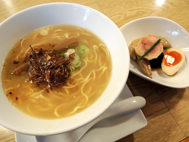 ちょっと前の訪問なので、情報は最新じゃないかもしれません。 ラーメンメニューは1種類のみ。まず別皿の具材のみが提供され、遅れて丼が出されます。スープは鶏白湯と表現するにはちょい濃度低めの鶏ベース+魚介のスープ。コレがイイ味してるんですよね。タレ味控えめで上品な味わい。 麺はボソっとした食感の中太やや縮れ。太陽食品の麺箱が有ったので、そうなのでしょう。あまり好みでは無いタイプ。 別皿の具材は手間が掛かってますね。骨を抜いた手羽煮に鶏チャーシュー、椎茸の炊いたんと煮玉子。原価率高めの仕事です。 山葵飯にも一手間掛けてこの値段。お得感満載です。 そろそろ新たな展開がされているのか、要確認です。 (13年10月19日訪店)