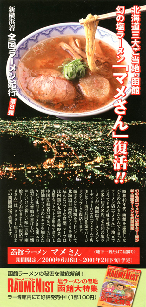![]() パレマルシェ神宮の北海道物産展、過去のイートインは製麺所のラーメンとかが出店したことはありますが、有名店が来るのはおそらく 初じゃないでしょうか(適当です)。マメさんは2000年にラー博で食べて以来9年ぶり。当時は写真を撮っていなかったので、ラーメン画像は ありませんが、チラシがちゃんと残してありました。 昔し塩がオススメだと店員さんが言うので、デフォの塩ではなく昔し塩ラーメンを注文。昔し塩ラーメンは縮れ玉子麺、デフォは 包丁切りのフノリ練り込み麺であることに後から気付く。失敗だ。 スープはあっさり系でいい塩梅。鶏油のクドさもないです。麺は固めの茹で加減で食感良し。モモ肉のチャーシューはパサつかない 程度。これがデフォだと、スープには豚の焦がし背油入り、チャーシューは肩ロース・・・しまったなぁ。 具材で目を引くのが、麩。スープをたっぷり吸って、とろけるような舌触りがいい感じ。 ![]() 同行者が注文したのは、一日限定50食のいか醤油ラーメン。イカ魚醤がベースとのことですが、思ったほどイカ臭さを感じさせない、 絶妙なイカ具合(笑)。これはこれで有りですね。 (09年9月12日訪店) |