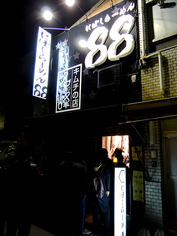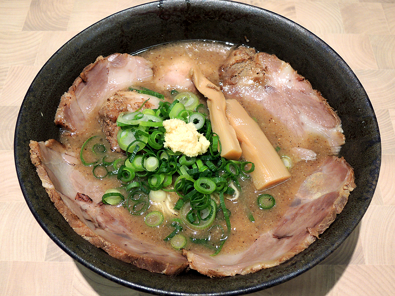 梦麺88@大須の2号店ということになるのでしょうか。キムチ店の奥に2月4日オープン、当日夜に行ってきました。早めの時間だったので並び無しで席に着けましたが、あっという間に行列ができていました。 この日と次の日はオープン記念ということで、つけ麺orらーめん500円の提供のみ。らーめんをいただきました。 鶏白湯ベースに煮干を投入したスープ。店主曰く、この日の出来は70%とのこと。鶏感や煮干のエグミは抑え気味で、ジョリジョリ感で食べさせるような。その前にだいぶヌルかった。 細ストレートの麺はパツンとした食感。丼をぐるりと囲むチャーシューは、厚めのスライスで濃い目の味付け。スタッフが間違えて厚くスライスしてしまったとのことで、本来は薄切りだそうです。冷たいチャーシューでスープ温度がさらに低下。真ん中の黄色いのは、臭み消しのおろし生姜。 この日はオペレーションも安定していませんでしたし、落ち着いてからまた食べてみます。 (14年2月4日訪店)